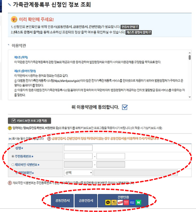 3. 신청인 정보 조회란에 개인정보를 입력하세요. 공동인증서 혹은 간편인증을 진행합니다.