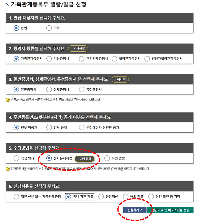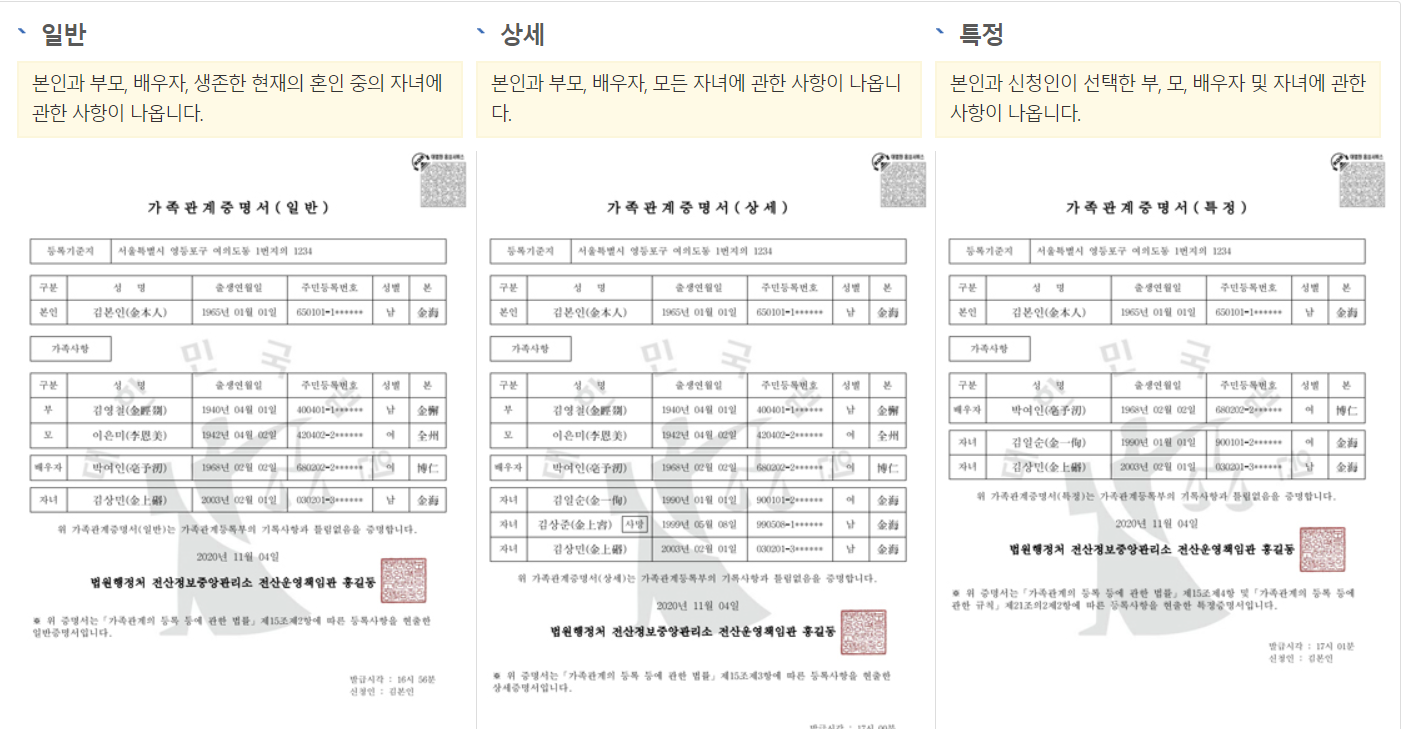 대부분의 기관에서는 가족관계증명서를 일반이 아닌 상세증명서로 발급하라고 합니다.