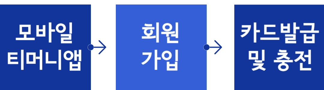 신청방법은 2가지가 있습니다. 모바일 티머니앱으로 ‘모바일 카드’를 발급받거나 실물카드를 직접 구매하여 사용할 수 있습니다. 먼저 모바일 카드 발급을 설명하겠습니다.