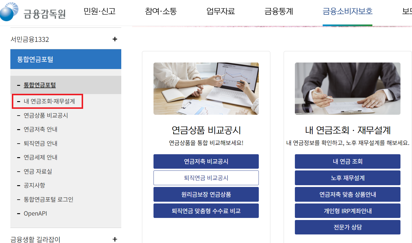 1. 통합연금포털로 이동 ➡️ 내 연금조회&재무설계 클릭!