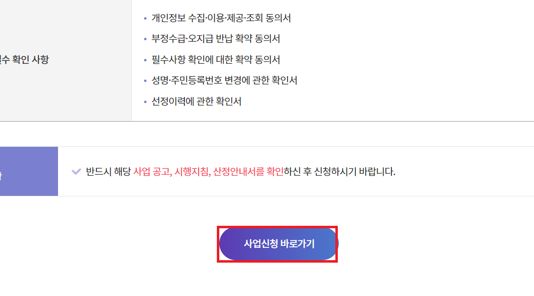 일반 예술활동준비금 사업 하단에 사업신청 바로가기를 클릭하세요.