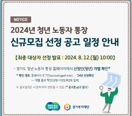 최종 대상자 선정 발표는 2024년 8월 12일 월요일 오전 10시, 경기도 청년 노동자 통장 홈페이지에서 확인하실 수 있습니다.