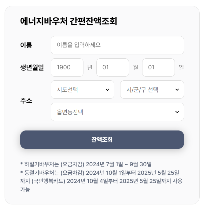 에너지 바우처를 신청했는데 바우처 잔액이 얼마가 남았는지 확실히 모르시죠? 1분 안에 간편하게 에너지 바우처 잔액조회를 할 수 있습니다. 에너지 바우처 홈페이지에서 개인 정보를 입력 후 확인할 수 있으니 아래 링크를 통해 빠르게 이동할 수 있습니다.